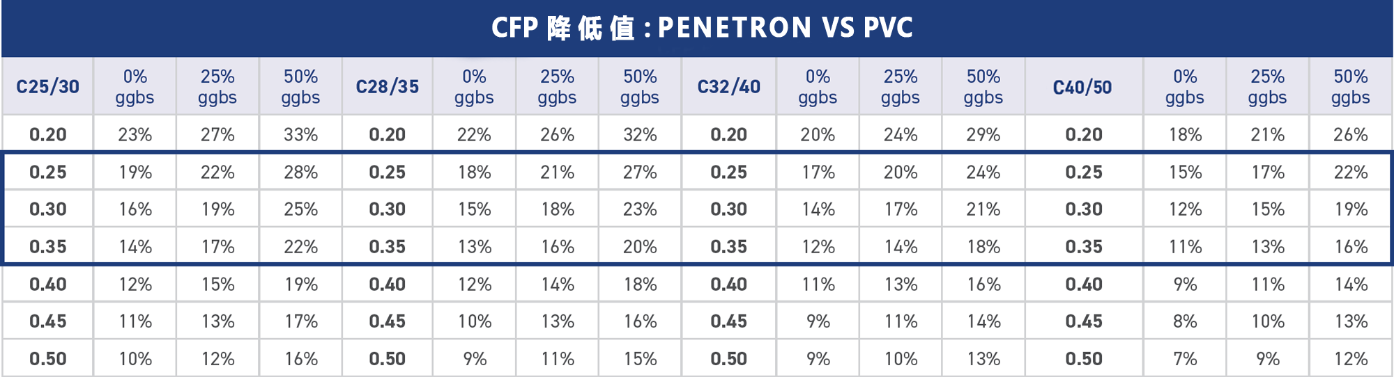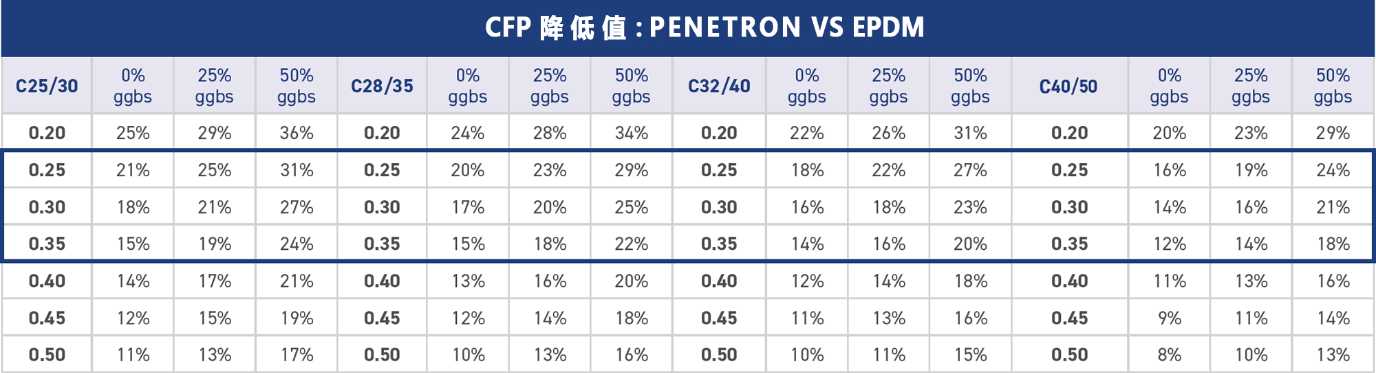 按照結(jié)構(gòu)平均厚度0.25-0.35m計算每平方米混凝土的CFP,將PENETRON ADMIX 澎內(nèi)傳混凝土防水添加劑(PNC803)與上述表面處理方案進行比較?,結(jié)果見右表。